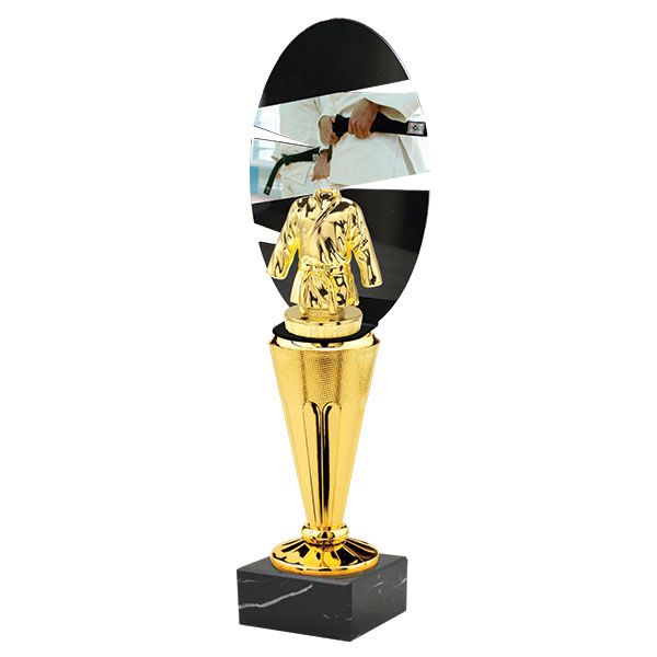Statuetka karate wykonana z wysokiej jakości, czarnego akrylu, ozdobiona efektowną grafiką karate naniesioną poprzez nadruk UV.
